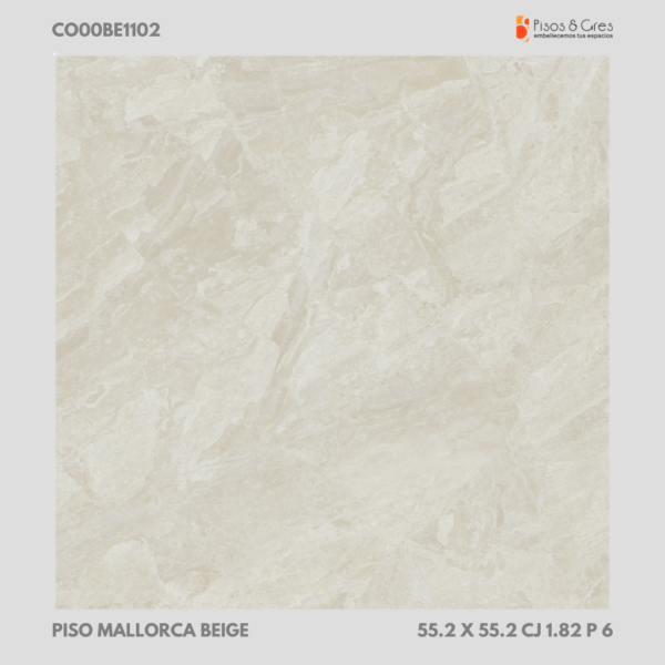 El Piso Mallorca Beige es la opción ideal para quienes buscan sobriedad, calidez y elegancia en sus espacios. Su diseño con 4 caras diferenciadas y una armoniosa mezcla de mármoles en acabado brillante realza su aspecto natural, brindando una sensación de amplitud y sofisticación.